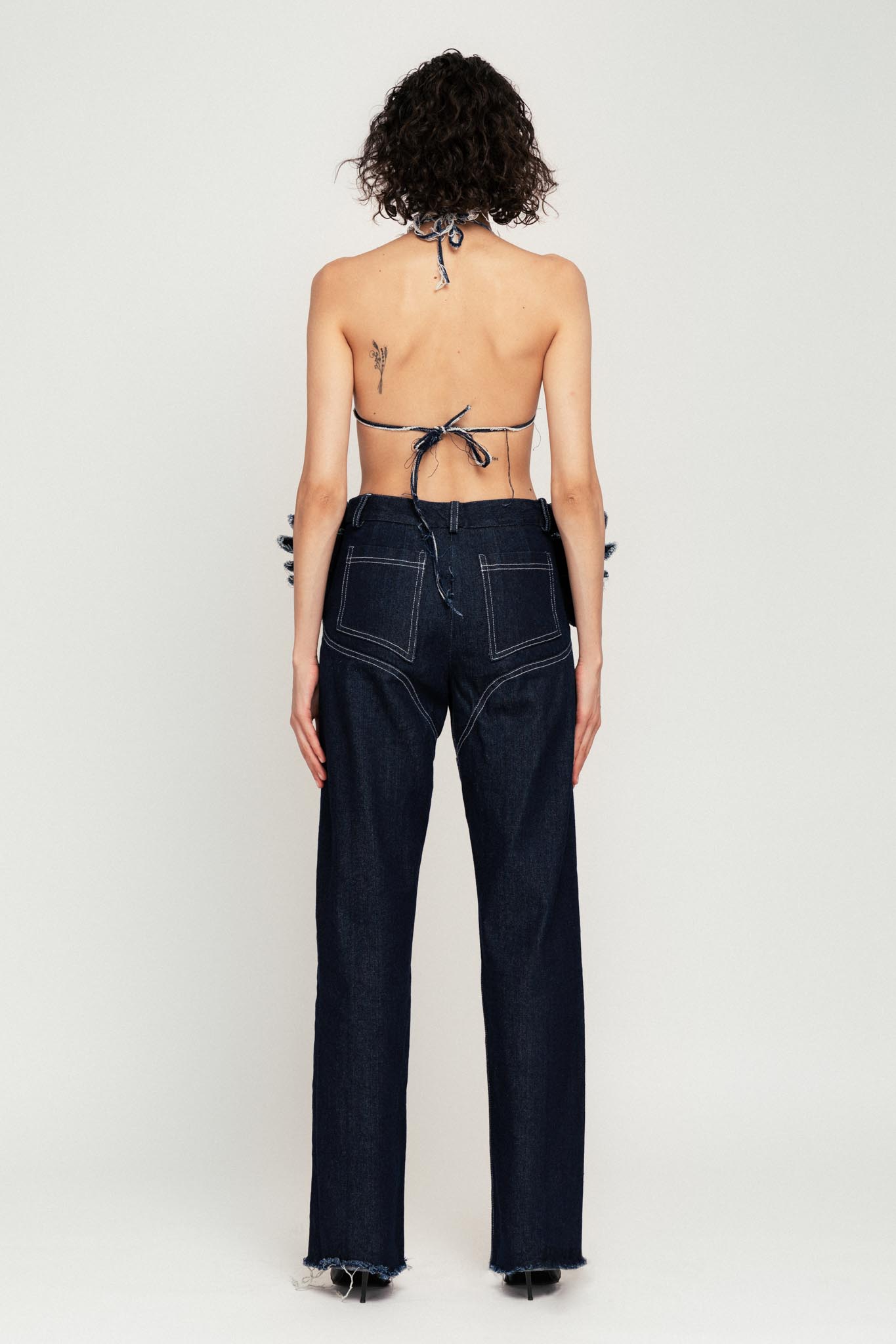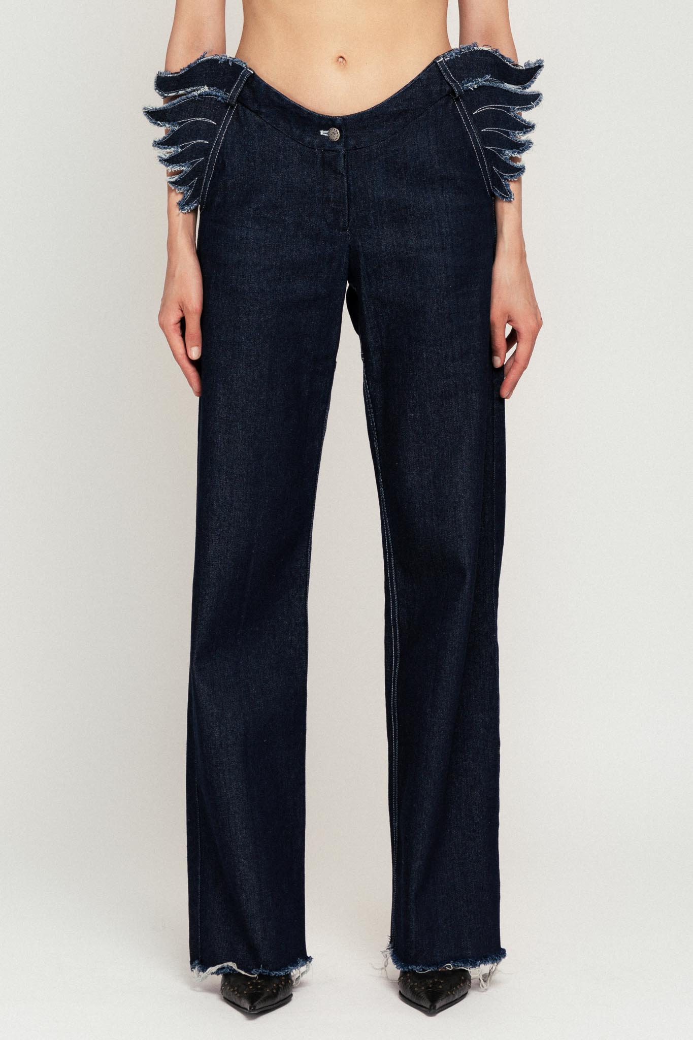 Baggy trousers in washed denim with our signature ’’Siren Waist’’ and laser cut wings detail.